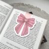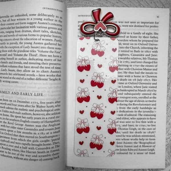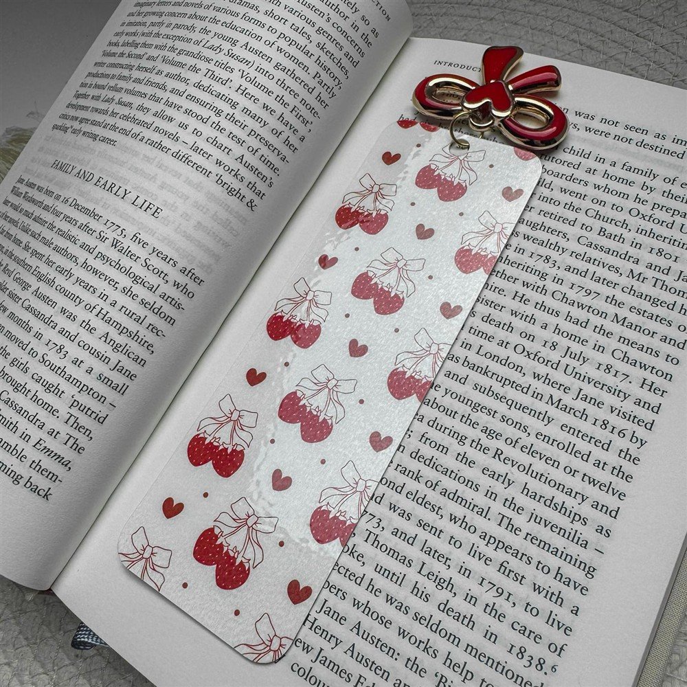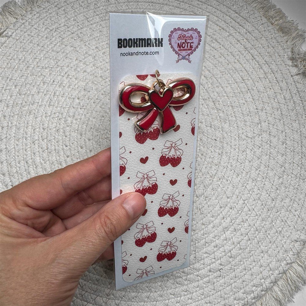 Finished with a glossy lamination and a matching red bow charm, this bookmark is made to stand out while keeping your pages safe and stylish.