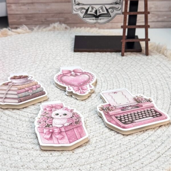 Add a dreamy, romantic touch to your reading routine with this pink coquette magnetic bookmark set of four. Featuring four coordinating designs—including a vintage typewriter, strawberry book stack, heart locket, and kitten gift illustration, this set brings softness, nostalgia, and charm to every page you mark.