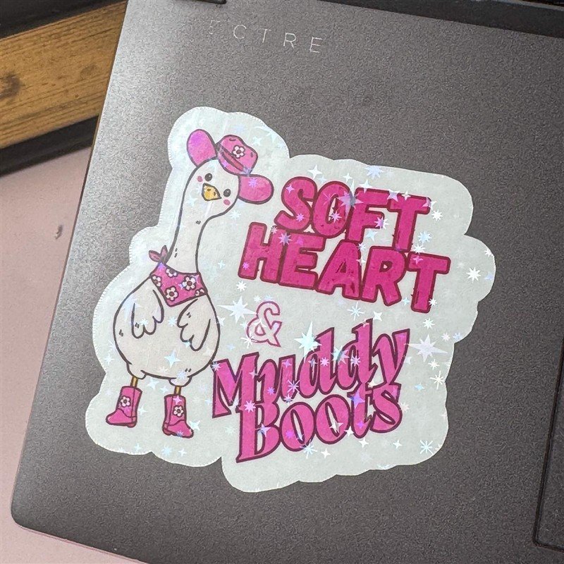 Bring a little countryside charm to your day with the Soft Heart & Muddy Boots sticker. Featuring an adorable goose in pink boots and a matching hat, this holographic vinyl sticker is the perfect mix of sweet and sassy. With soft pastel tones and a subtle sparkle, it’s made for those who love cute, coquette-inspired designs with a cozy twist.